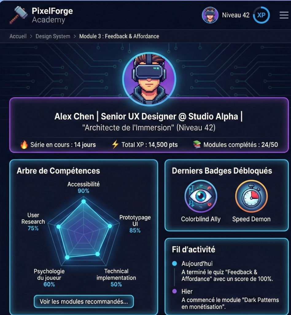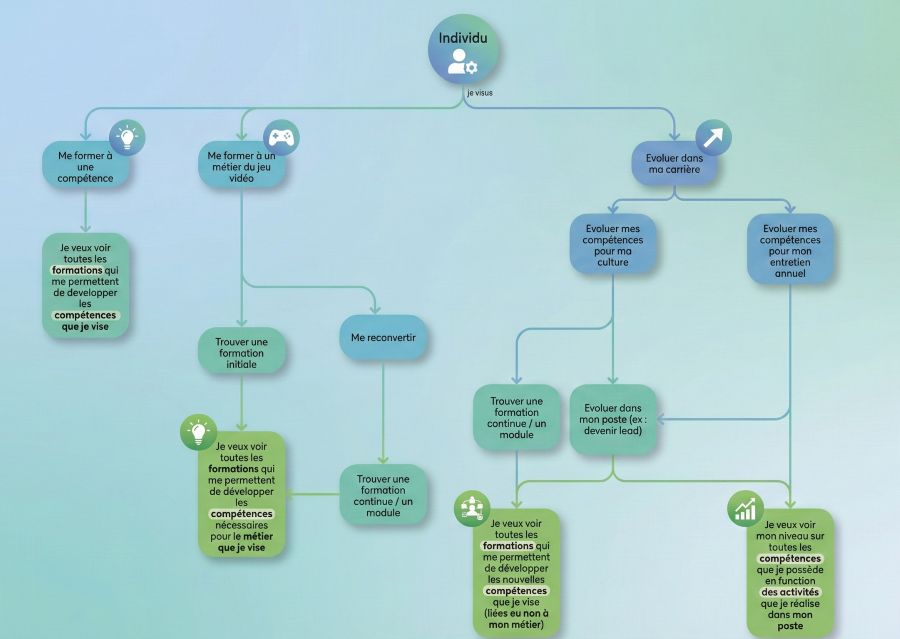 Plus globalement, le travail mené a permis de mettre en place une vraie démarche de R&D au cours de laquelle recherche d’outils et conceptualisation ont été menés de front pour répondre aux problématiques concrètes : comment définir un référentiel incluant des micro-compétences, comment prendre en compte la différence entre métier et poste en entreprise, comment faciliter la mise en place de formation et la montée en compétences, etc. Ces questions, ici appliquées au jeu vidéo, traversent finalement tous les secteurs concernés par la formation professionnelle.