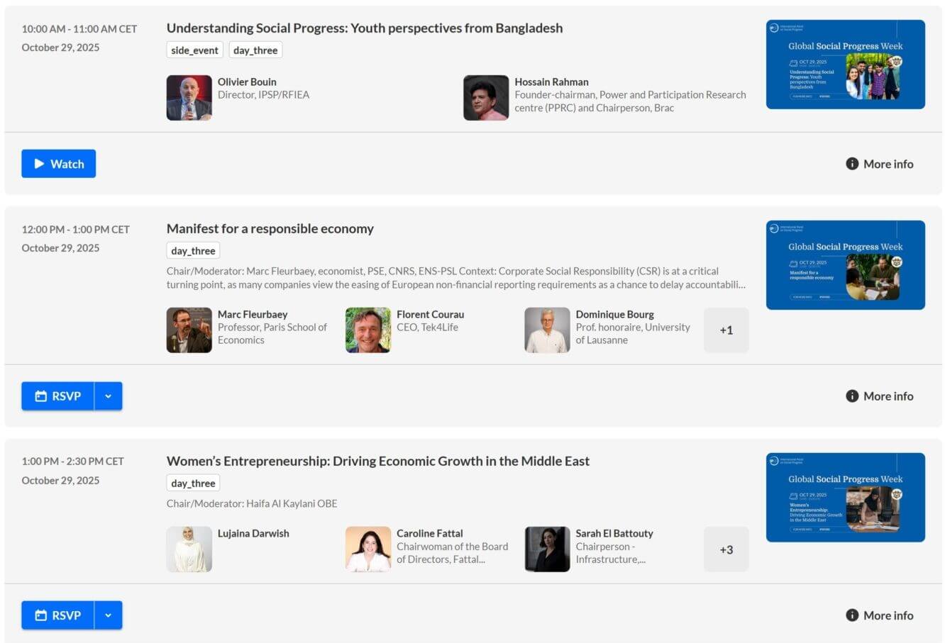 La Global Social Progress Week s’est déroulée dans différentes régions d’Afrique, d’Asie, d’Europe, d’Amérique latine, d’Amérique du Nord et du Pacifique, l’événement combine des séances plénières, des débats thématiques et des événements parallèles sur des sujets tels que les nouvelles mesures de la prospérité, les moteurs de la transformation systémique, la sécurité humaine, la solidarité mondiale et le changement technologique.