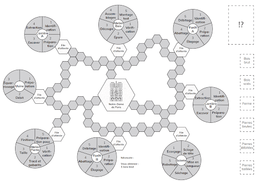 Dans cette première version du jeu, le concept est déjà présent : les joueurs doivent parcourir différentes parties du plateau pour récupérer les matériaux qui vont permettre de reconstituer Notre-Dame. Pour avancer sur le plateau, ils doivent répondre à des questions relatives au chantier. Problème : les joueurs ne comprennent pas facilement la mécanique et le mode de déplacement sur le plateau.